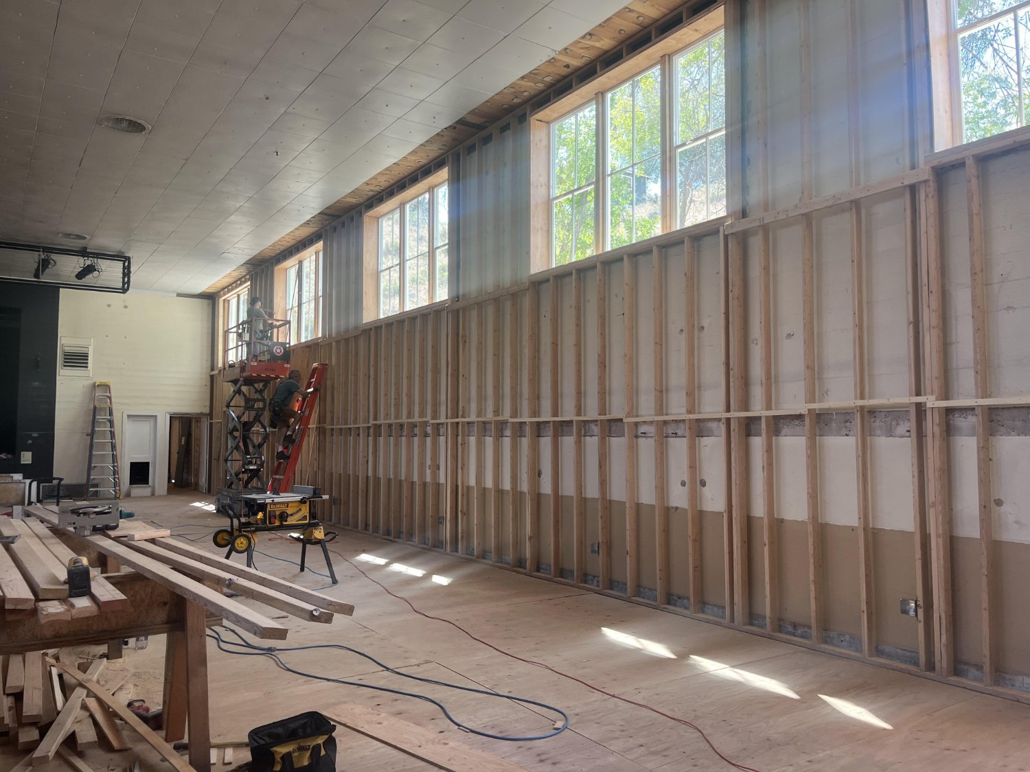 The gym walls are readied for insulation-something the building has never had. The interior walls are firred in to prepare for the addition of insulation.